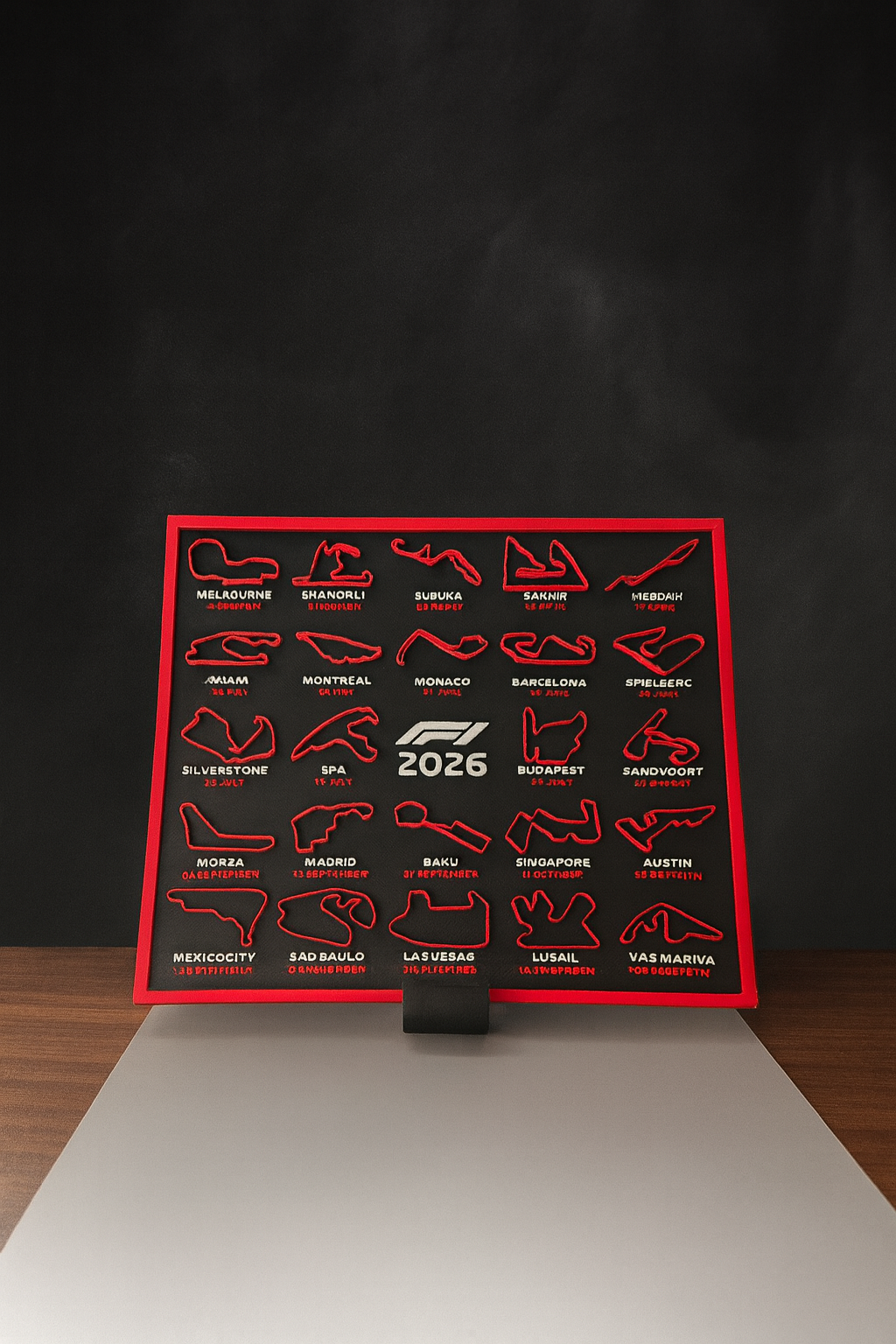 Fabricado en PLA+ de alta resistencia, este calendario decorativo reúne todas las pistas, nombres y fechas de la temporada 2026 de la Fórmula 1 en un diseño minimalista y moderno.